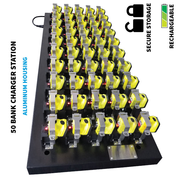 The 5560-CHGR50 Cap Lamp 50 Bank Charging Station has an aluminum housing with 50 glass-filled nylon chargers for use with the Nightstick XPR-5560 and XPR-5561 series Cap Lamps. This charger can be mounted to a wall or to any solid surface outside of a hazardous environment. The Cap Lamps slide into place inside of the charger and lock securely in place. Each mounting location includes a locking mechanism to secure individual cap lamps. Pad locks not included. This bank charging station includes a 15 foot US 18/3 SJTW AC power cord. Nightstick cap lamps sold separately.